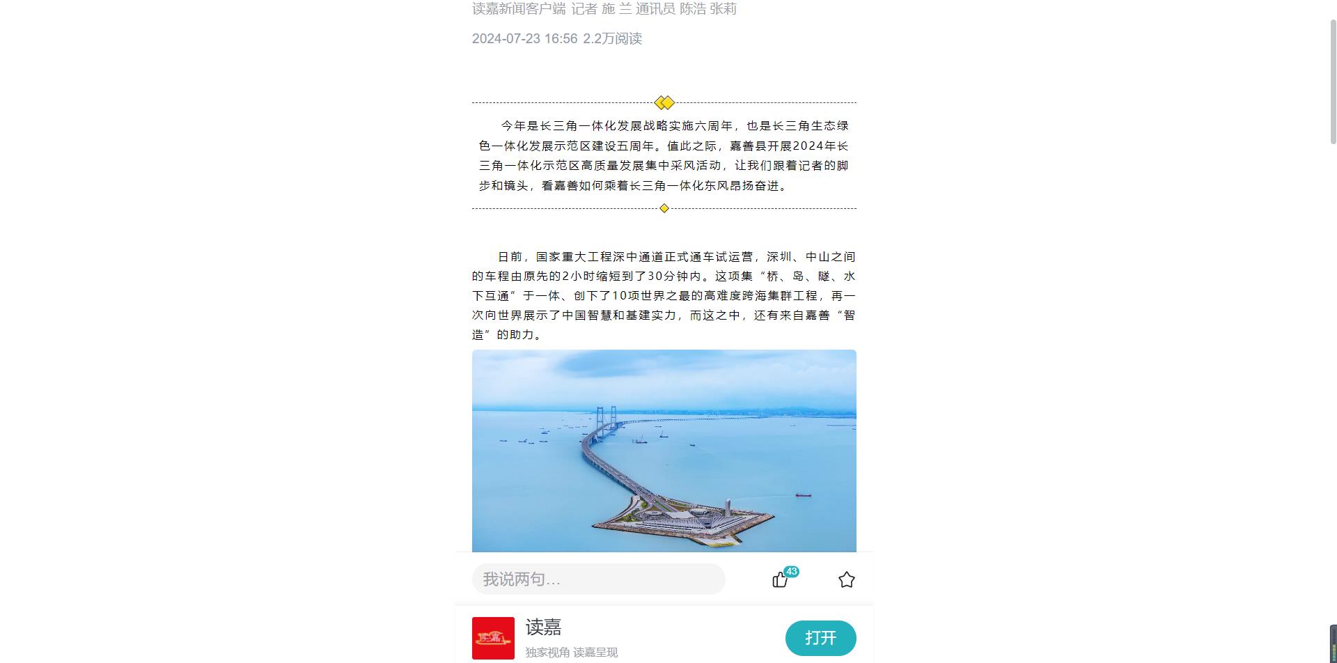 今年是長三角一體化發(fā)展戰(zhàn)略實施六周年,也是長三角生態(tài)綠色一體化發(fā)展示范區(qū)建設(shè)五周年。值此之際,嘉善縣開展2024年長三角一體化示范區(qū)高質(zhì)量發(fā)展集中采風活動,讓我們跟著記者的腳步和鏡頭,看嘉善如何乘著長三角一體化東風昂揚奮進。