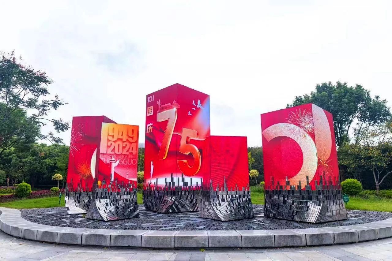 位于經開區(qū)立德道的無錫市民中心地鐵口旁,中間大氣端莊的金色數字“75”,以上海三思異形LED顯示、裸眼3D等創(chuàng)新技術,搭配酷炫的3D剪紙翻頁、數字浮雕效果,記錄著祖國母親走過的歲月。
