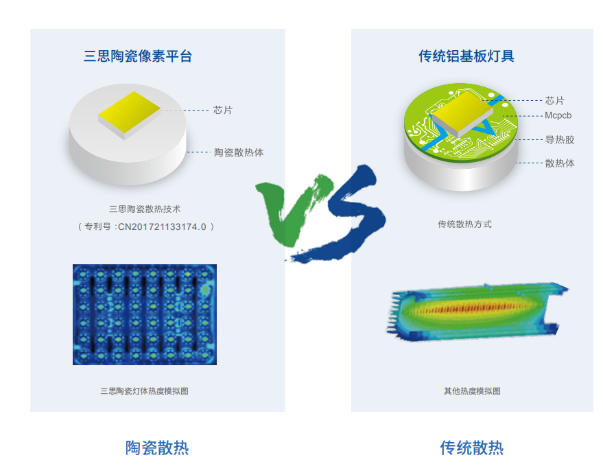 這種三思獨(dú)特的技術(shù)路線,比市面上的Mcpcb方案具備幾大顯著優(yōu)勢(shì):散熱性更強(qiáng),散熱更快;降低光衰,延長(zhǎng)使用壽命;同等額定功率的光效更高,或者用三思更低的功率LED陶瓷燈具實(shí)現(xiàn)同等的光效,由此達(dá)到更節(jié)能、更安全的目的。