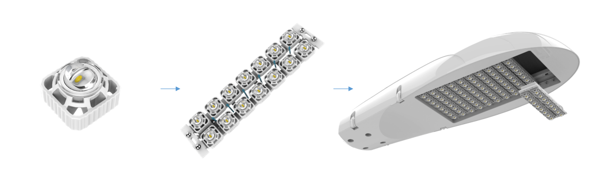 LED芯片自封裝→單顆像素的光學(xué)設(shè)計(jì),并成獨(dú)立發(fā)光體(獨(dú)立像素發(fā)光)→多顆像素組合成發(fā)光模組→根據(jù)應(yīng)用環(huán)境需求配置不同功率的成品路燈頭。