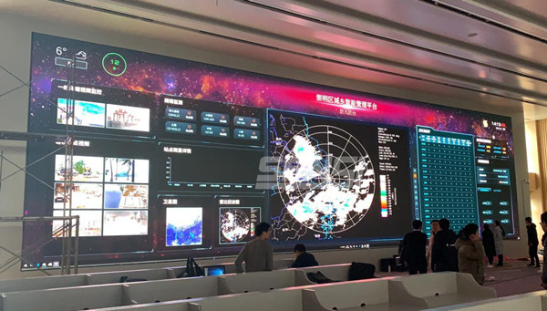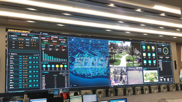 在崇明城運中心3層指揮大廳內,一塊點間距1.25mm全彩小間距LED主屏格外矚目,160°廣視角,整屏觀看全覆蓋,借助超高清分辨率信號傳輸技術實現顯示畫面100%數字化與點間距微縮化,畫面流暢無撕裂。