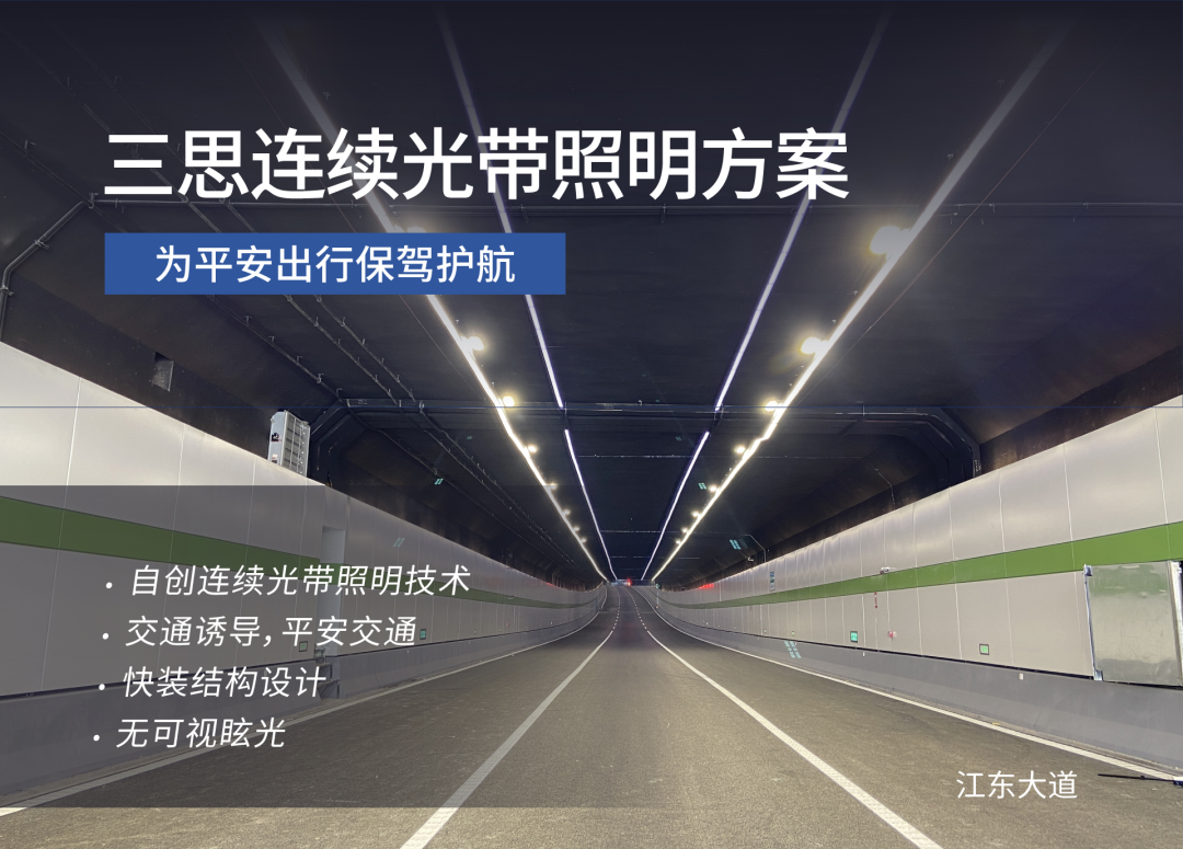 連續光帶模式的隧道照明系統,是三思為其量身定制的創新解決方案。隧道全程共計使用三思萬余臺LED隧道燈,涵蓋定制結構式配光、智能控制的面板式隧道燈、陶瓷散熱隧道燈等。