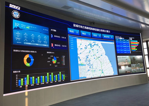 為滿足海事船舶相關數據資源的大數據可視化指揮、調度需求,提高其對海洋和陸地環境變化趨勢的預判,使海事工作具有更強的決策力、洞察發現力和流程優化能力。三思小間距LED可視化大屏幕系統提升了海事安全監管信息化、數字化、后臺化管理水平。