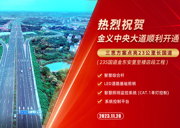 在剛開通的金義中央大道項目中,三思為235國道(金東安里至樓店段)提供的道路照明系列產品及系統,點亮這條23公里長的“美麗公路”。基于智慧道路基礎設施,涉及配套建設多功能綜合桿、智慧照明監控管理平臺等,以科技助力浙江省全面落實建設高水平交通強省。