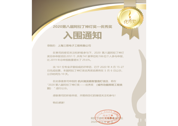 第八屆阿拉丁神燈獎評選在4月末正式拉下帷幕,上海三思憑借杭州湖濱路智慧路燈項目入圍“優(yōu)秀工程獎”,這是上海三思2020年以來智慧燈桿榮獲的重要獎項之一。