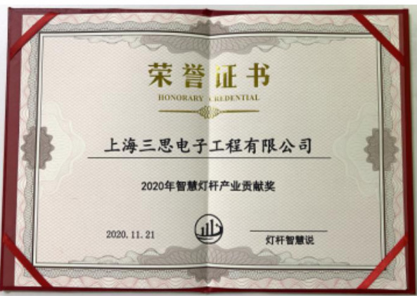 在頒獎儀式上,上海三思獲“2020智慧燈桿產(chǎn)業(yè)貢獻(xiàn)獎”,該獎項是對深耕智慧路燈行業(yè)多年企業(yè)的肯定和鼓舞,對上海三思為智慧燈桿產(chǎn)業(yè)發(fā)展做出積極貢獻(xiàn)的褒獎。