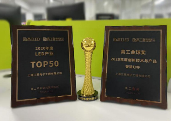 12月15日,2020高工LED年會暨高工金球獎頒獎典禮在深圳隆重舉行,作為LED行業(yè)極具公信力、影響力和權(quán)威性的評選,上海三思憑借雄厚的技術(shù)實力和過硬的產(chǎn)品質(zhì)量,一舉榮獲兩大獎項——“2020年度創(chuàng)新技術(shù)與產(chǎn)品——智慧燈桿”和“2020年度LED產(chǎn)業(yè)top50”。