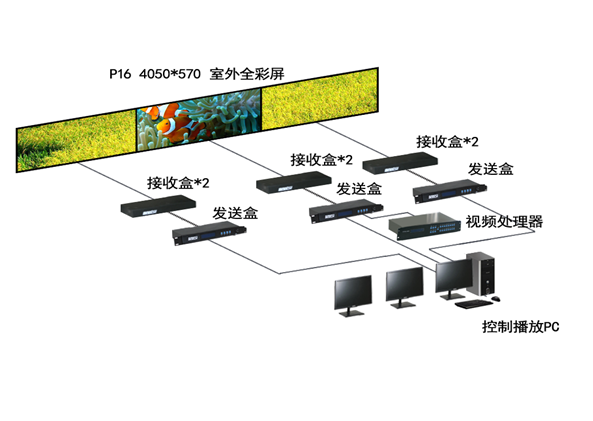 LED顯示控制系統(tǒng)主要包括:V3發(fā)送盒(發(fā)送卡,Sender),V3接收盒(接收卡,Receiver),V3掃描板(Scan board),V3架構(gòu),視頻處理器,視頻拼接器。