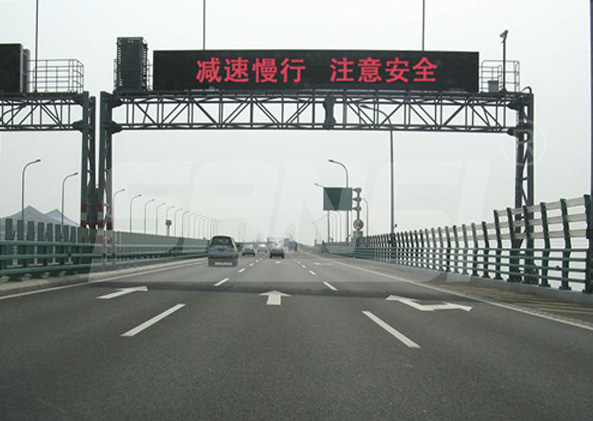 LED可變信息標志不僅可清晰準確地播出文字及圖形內容 ,還有著視距遠、視角廣、亮度高、顯示內容靈活、壽命長等優點。同時,它被安裝且長期工作于高速公路一類戶外嚴酷環境,對耐候性、防護性能、材料性能等有著頗為嚴格的要求。其信息發布系統的主要由——顯示機箱模組、配電系統、控制系統、傳感系統、信號傳輸系統組成。