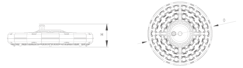 | C2300-CE-200W | 176 ~ 264 VAC 50/60Hz | ≥ 80 | 30º/60º/90º/120º | PC + 陶瓷像素 | 掛鉤 / 吊桿 / 吊鏈 | 常亮/DALI/0-10V | Φ370*H78.5mm | 約3.18KG |