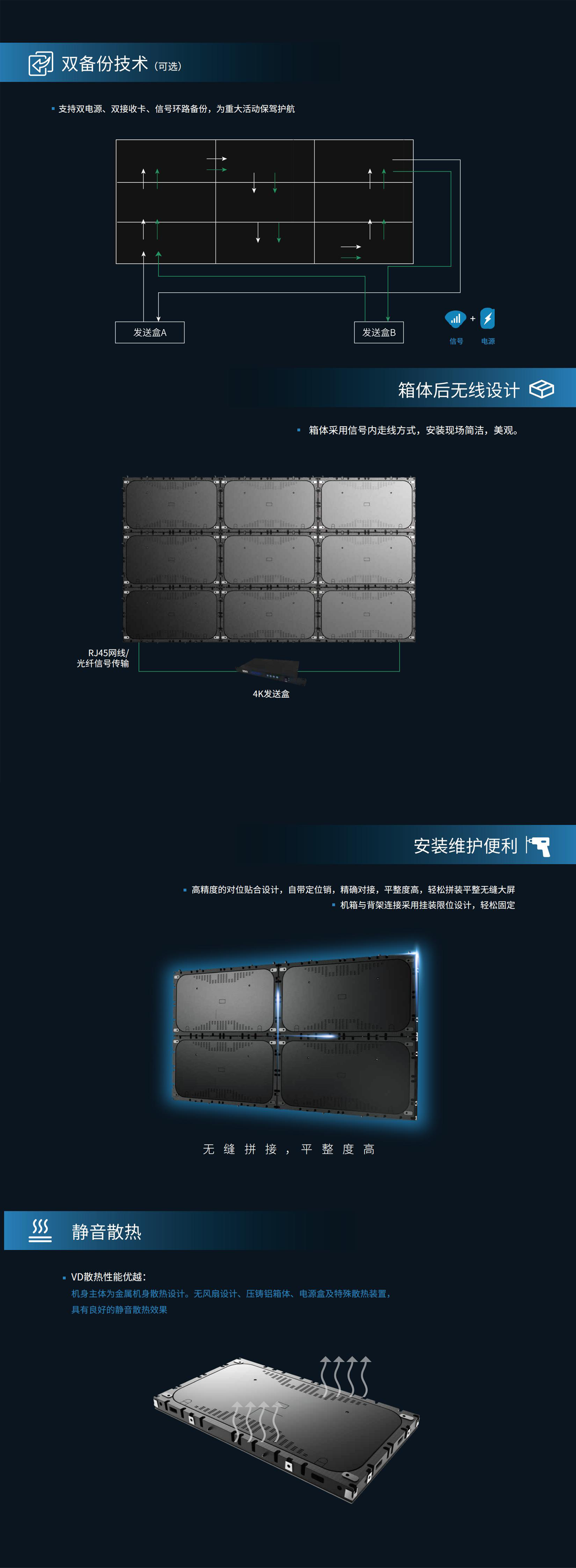 VD系列是一款高性價(jià)比、輕薄、設(shè)計(jì)簡(jiǎn)約的后維護(hù)顯示產(chǎn)品,適用于會(huì)議中心、演播廳、監(jiān)控中心等應(yīng)用場(chǎng)所。壓鑄鋁機(jī)箱纖薄輕巧,更小化安裝和運(yùn)輸成本。無需過多的人工調(diào)整便能達(dá)到小縫隙、平整的整體效果。背部散熱孔設(shè)計(jì)更好地發(fā)揮了空氣自對(duì)流散熱能力,產(chǎn)品運(yùn)行穩(wěn)定可靠。